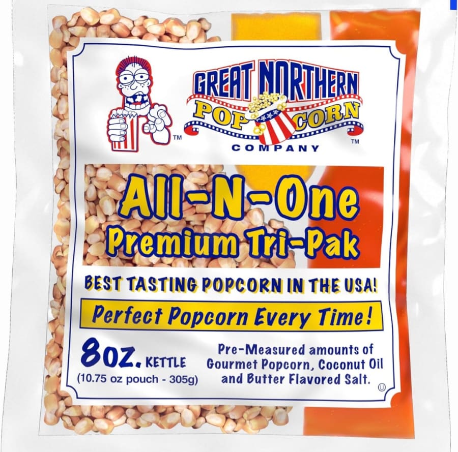Experience the best-tasting popcorn in the USA with the Great Northern All-N-One Premium Tri-Pak! Each 8oz kettle portion pack comes with pre-measured amounts of gourmet popcorn, rich coconut oil, and butter-flavored salt. Designed for convenience and consistency, this all-in-one pack ensures perfect, theater-quality popcorn every time. Each pack makes approximately 10 cups of popcorn, enough to serve 4–6 people, making it ideal for parties, movie nights, or special events.