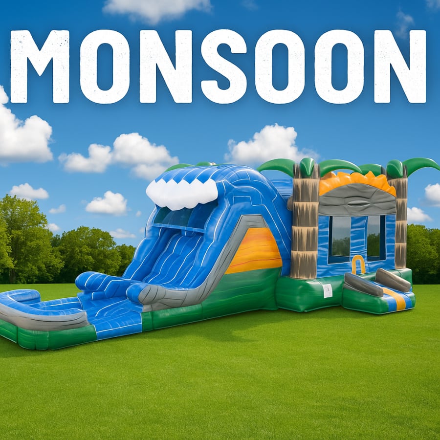 Make a splash this summer with the Monsoon (wet or dry) – our thrilling Dual Lane Water Slide rental, available from Tubular Inflatables! This high-energy inflatable is the perfect way to beat the heat and bring non-stop excitement to your next party or event. Featuring two lanes for racing, a tall platform, and a refreshing splash pool, the Monsoon is a favorite for birthdays, church festivals, school events, and backyard get-togethers.