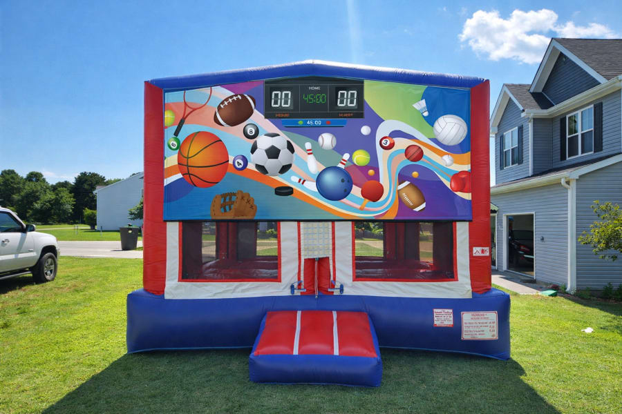 This themed banner helps turn a standard bounce house into a fun sports-themed attraction.