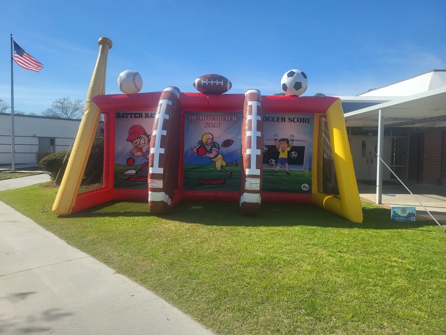 Interactive inflatable game featuring soccer, football, and baseball target challenges.