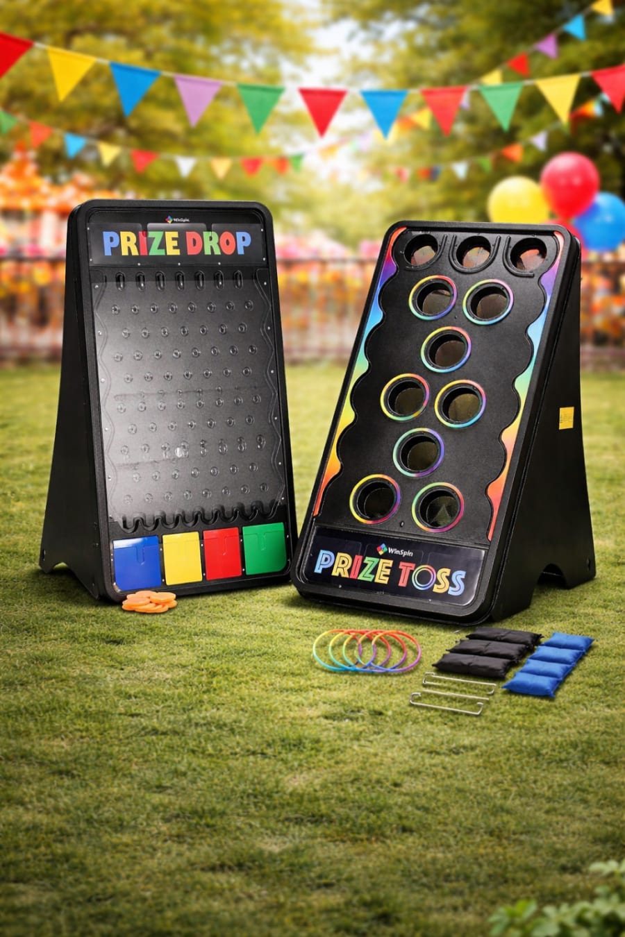 The Prize Drop Game challenges players to release a token from the top and watch it bounce through pegs before landing in a prize slot, creating suspense and excitement every time. The Prize Toss Game adds a skill-based challenge where players aim rings or bean bags at targets to score points or win prizes.