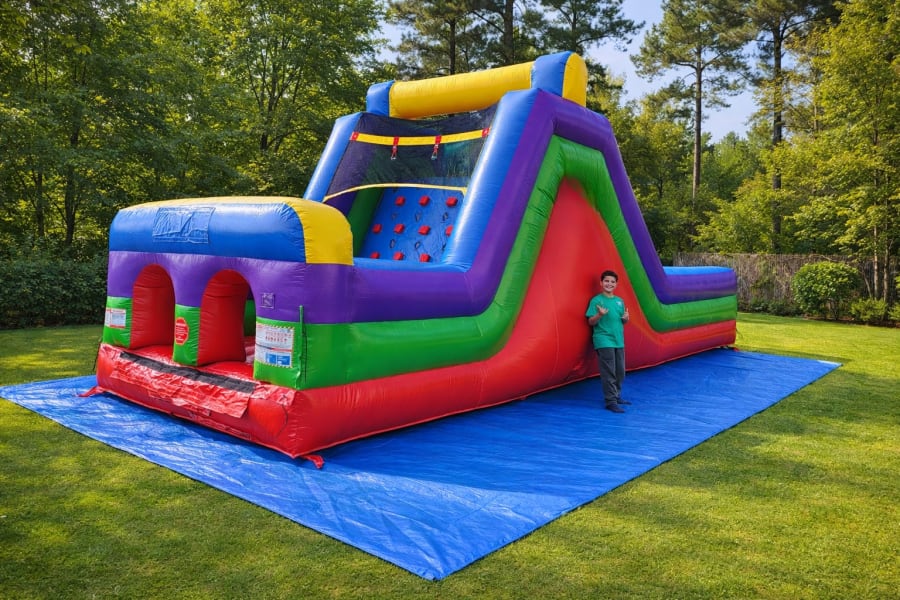 With its bright retro rainbow colors and competitive design, the Summit Slam Rockwall is perfect for birthday parties, school field days, church events, and community festivals throughout Eastern North Carolina. The combination of climbing and sliding makes it one of the most exciting inflatable attractions available.