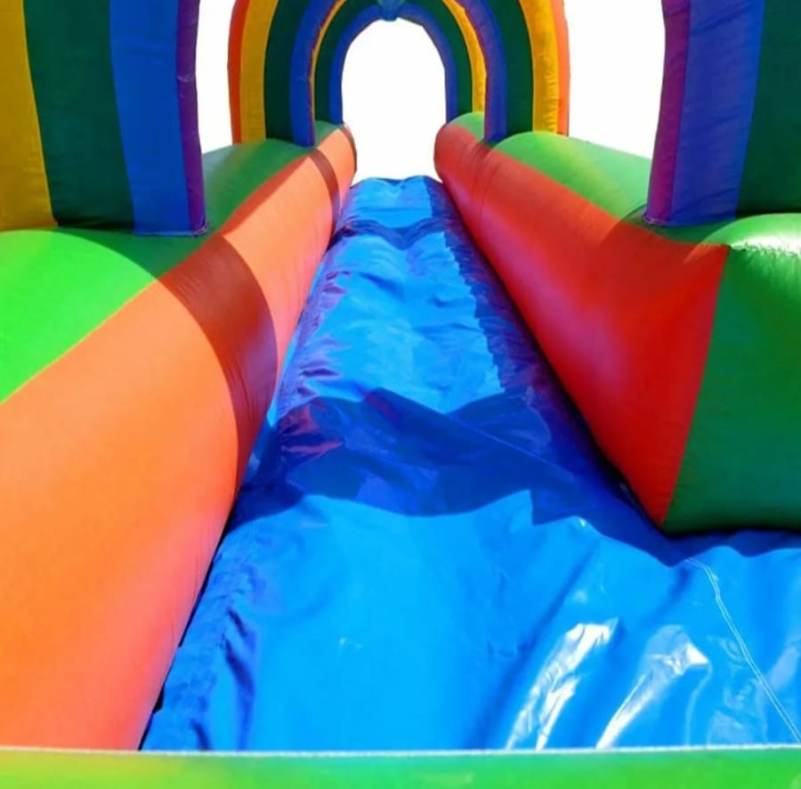 Turn up the fun with our Rainbow Slip & Slide Water Slide (wet only)! This bright and colorful inflatable adds non-stop excitement to any event, from birthday parties and family gatherings to community festivals and backyard BBQs. The lower height design makes it safer for younger kids, while the vibrant rainbow arches create a visually stunning centerpiece for your party.