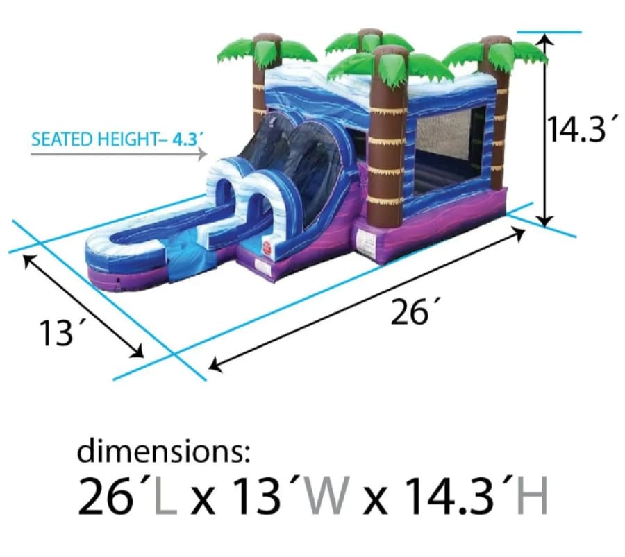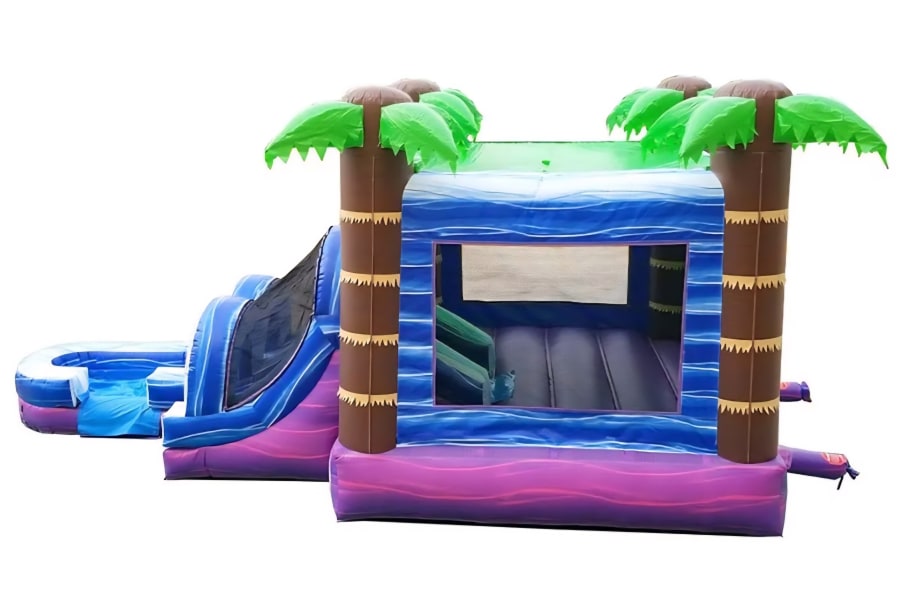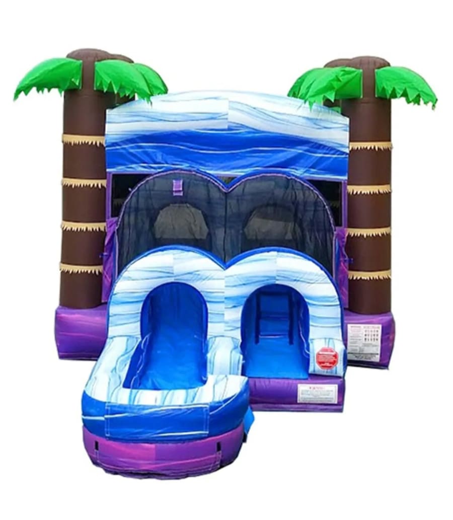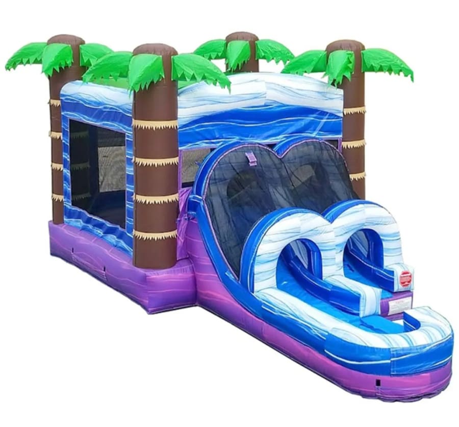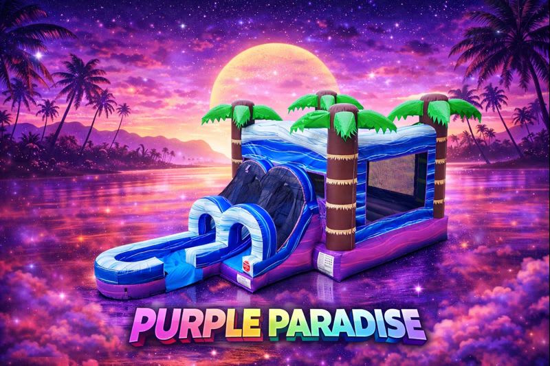 Turn your party into a tropical adventure with the Purple Paradise Combo Bounce House with Slide (wet or dry) available from Tubular Inflatables! Bursting with vibrant purples, blues, and tropical palm tree accents, this combo unit brings non-stop fun with a bounce area, climbing wall, slide, and splash landing. Whether used wet or dry, the Purple Paradise is a hit at birthdays, school events, and backyard celebrations throughout Hubert, Swansboro, Emerald Isle, and surrounding areas.