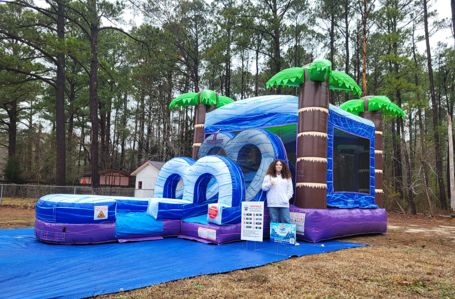 Bring colorful tropical fun to your next event with the Purple Paradise Combo Bounce House Rental from Tubular Inflatables. This vibrant inflatable combo unit offers multiple activities in one exciting attraction, making it perfect for birthday parties, backyard celebrations, school events, church gatherings, and community festivals throughout Eastern North Carolina.