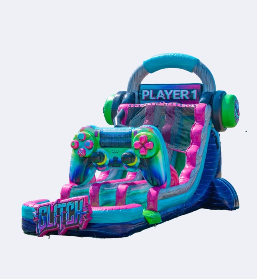 Featuring vibrant neon colors, a massive gamer controller centerpiece, and a thrilling 18-foot drop, the Glitch creates a standout attraction at any event. Whether you're hosting a backyard birthday party, school event, church gathering, or neighborhood celebration, this unit guarantees unforgettable memories and constant excitement.