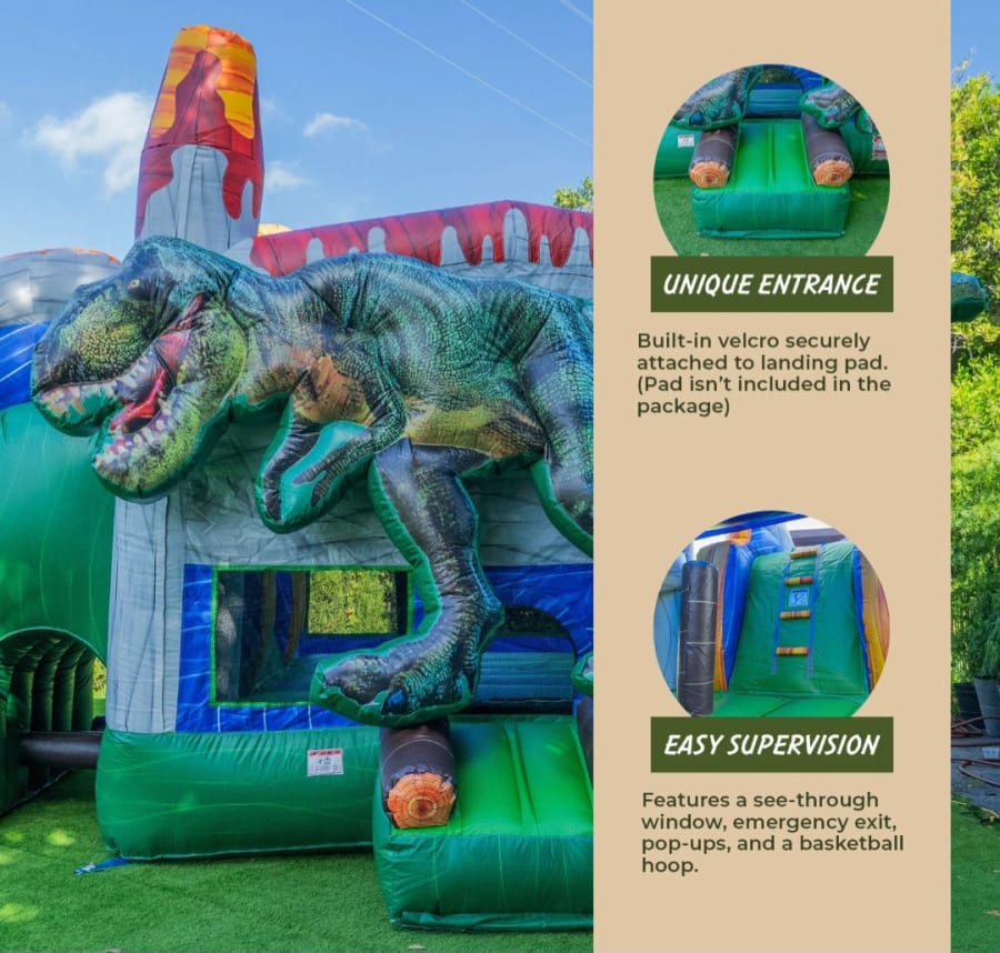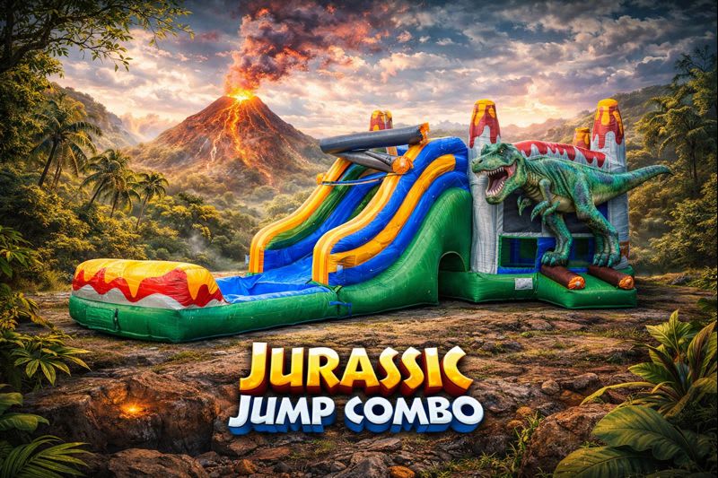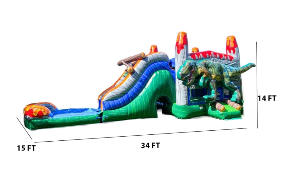 Take your event to the next level with the Jurassic Jump Combo, available for rent from Tubular Inflatables. Featuring a giant, eye-catching dinosaur at the front, this impressive inflatable brings together the fun of a bounce house with the excitement of a single-lane waterslide and refreshing pool. Perfect for birthday parties, family gatherings, and more, this inflatable is sure to be the highlight of your event.