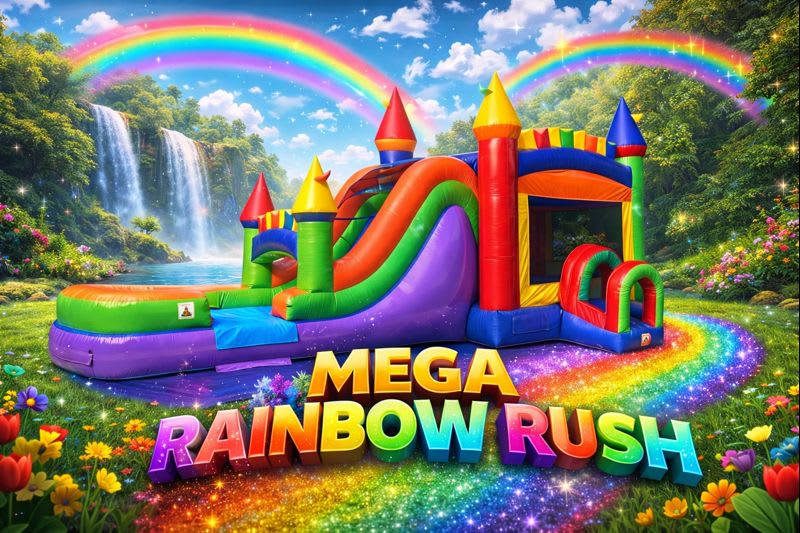 Add vibrant excitement to your next party or event with the Mega Rainbow Rush Water Slide Bounce House Combo (wet or dry)! This incredible inflatable combines the thrill of a water slide with the endless fun of a bounce house, creating the perfect centerpiece for birthday parties, corporate events, school fundraisers, family reunions, church gatherings, and more. Its colorful rainbow design and built-in splash pool make it an unforgettable experience for kids and adults alike. When it comes to party rentals, this is a must-have for keeping guests entertained and making your event stand out!