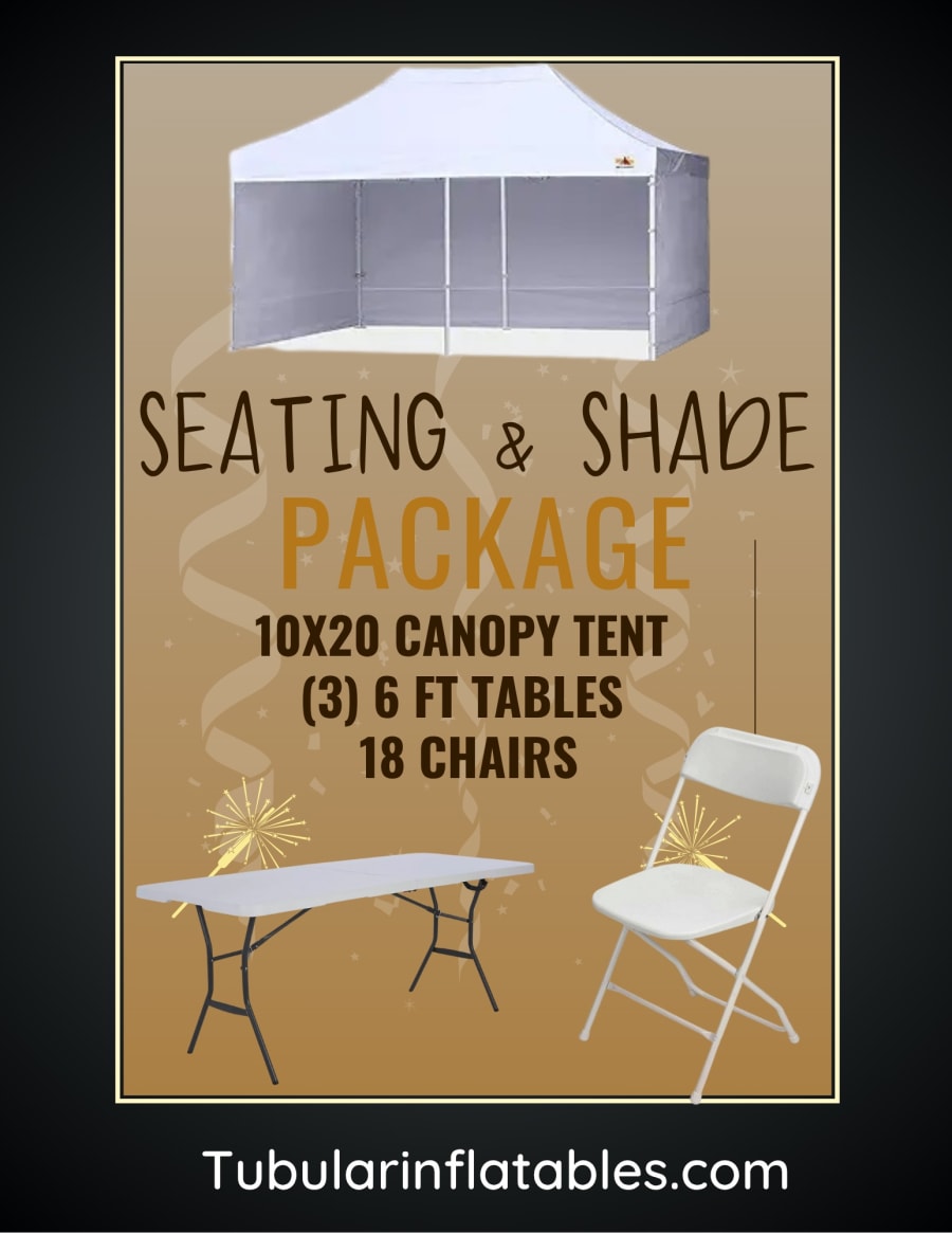 Make your next event comfortable and covered with our Seating & Shade Package—perfect for outdoor gatherings, parties, cookouts, and more! This all-in-one rental package from Tubular Inflatables includes: