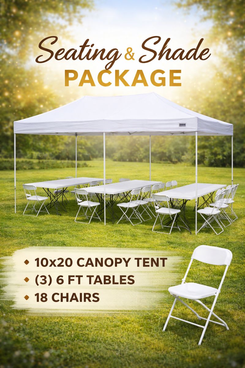 Whether you're hosting a backyard birthday, a graduation celebration, or a vendor booth at a fair, this package delivers both function and style. Save time and money by bundling these essential event rentals together!