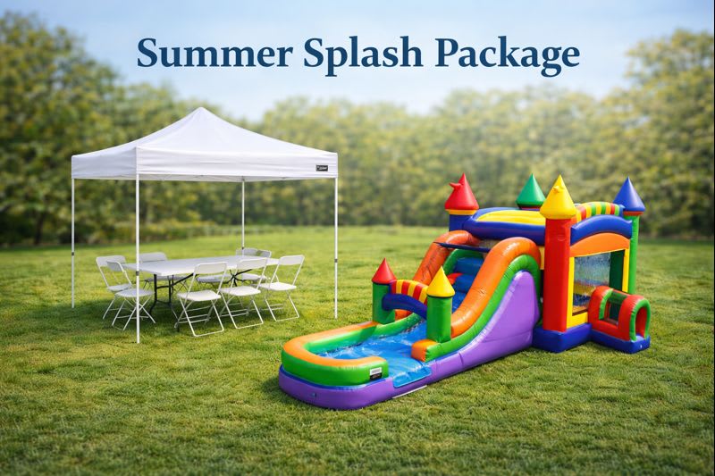Make a splash this summer with our Summer Splash Package! Whether you’re hosting a birthday, a neighborhood party, or a backyard barbecue, this all-in-one package has everything you need for a fun-filled event. Enjoy hours of entertainment with our Mega Rainbow Combo, stay cool with our 10x10 Commercial Canopy, and relax with our 6 chairs and 1 six-foot table.