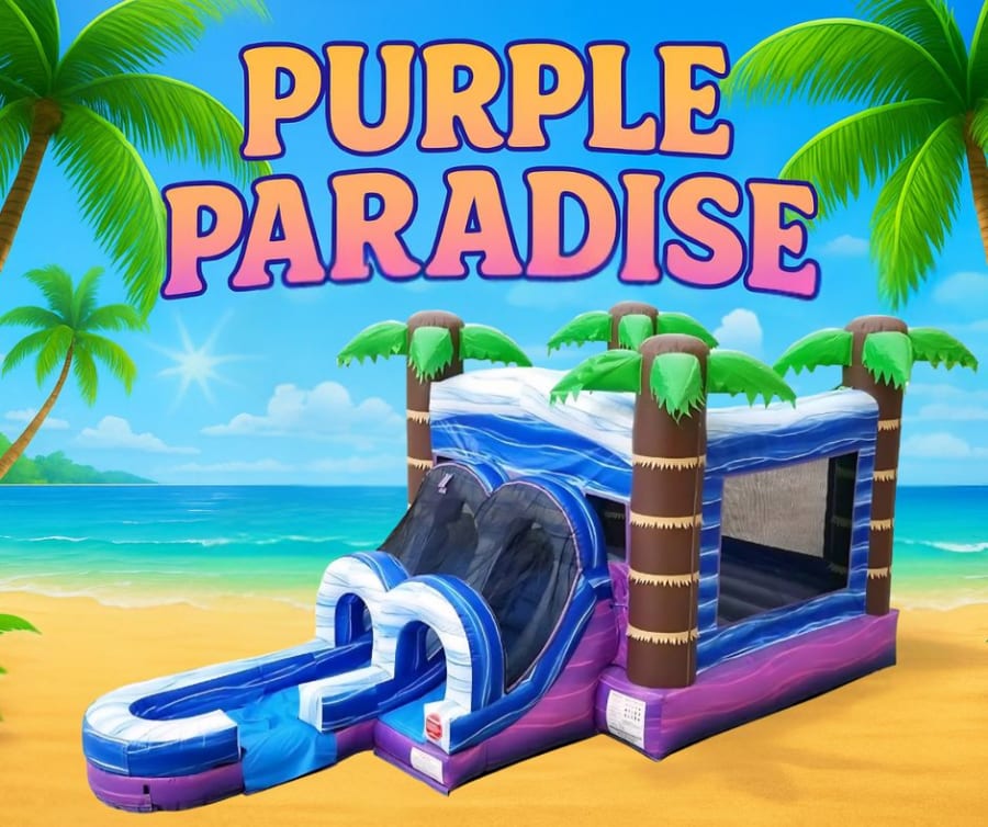 • Power Requirements: A standard 110V electrical outlet within 50 feet is required to power the Purple Paradise Combo bounce house with slide. Don’t have power nearby? Ask about our portable generator rentals!