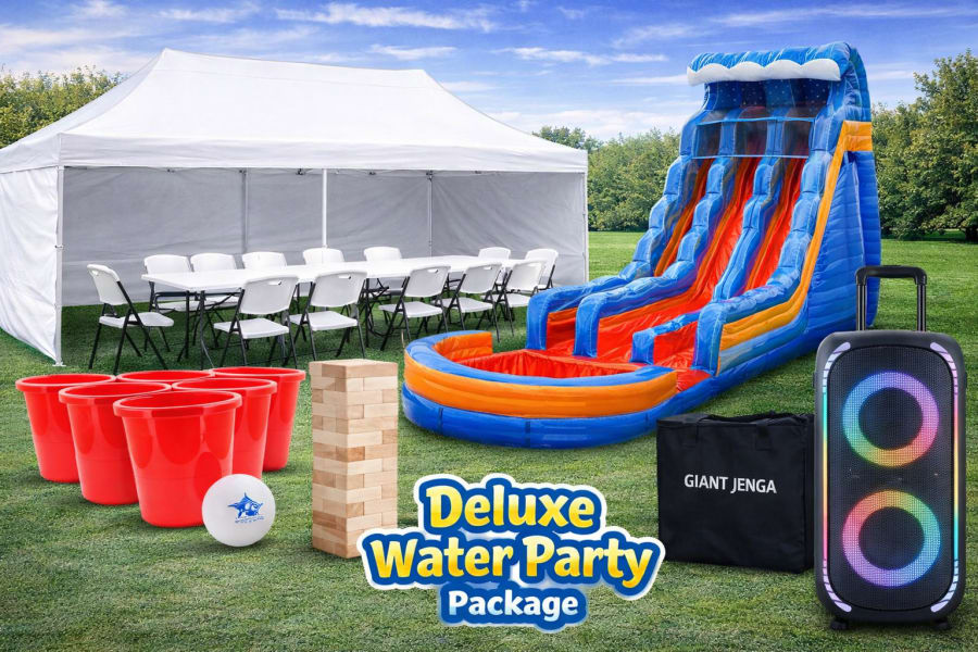 The Deluxe Water Party Package features the Sunset Splash 18ft Dual Lane Water Slide, creating fast-paced racing action and refreshing fun for all guests. To keep everyone comfortable, this package also includes a 10x20 canopy tent along with tables and chairs, providing shaded space for relaxing, eating, or socializing.