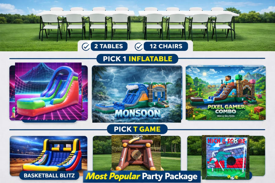 Take your event to the next level with the Most Popular Party Package from Tubular Inflatables. Designed for larger birthday parties, backyard celebrations, and high-energy gatherings, this package combines exciting inflatable attractions with interactive games and essential party setup to create a complete, stress-free experience.